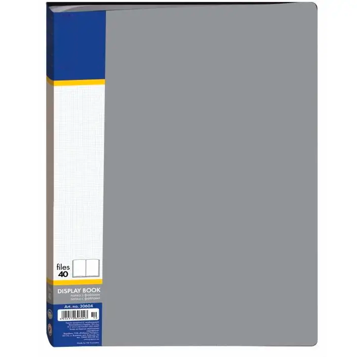 Виготовлена із пластику товщиною 700 мкм, має 40 прозорих вкладишів, а також кишеню на корінці для змінної етикетки.